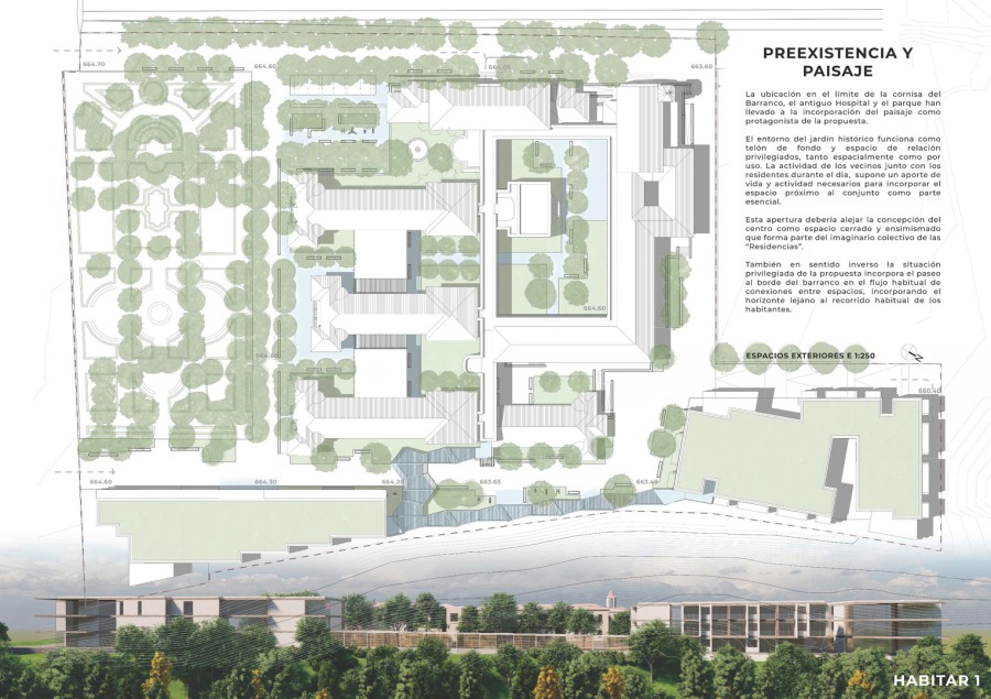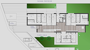 Edifico situado en la parte alta de la parcela, constituido por tres módulos paralelos. El central con predominio de zonas acristaladas con orientación sur, nexo de unión de los distintos ámbitos, con vistas a un entorno privilegiado constituido por grandes cerros.
