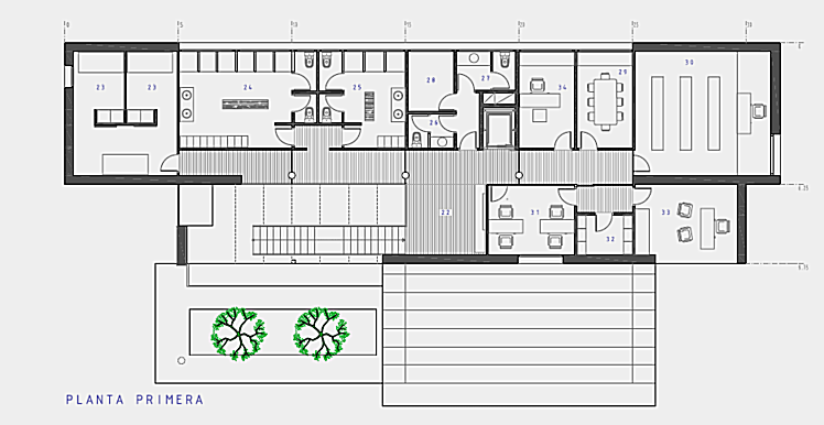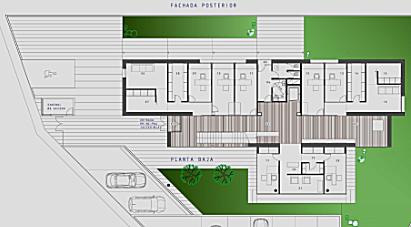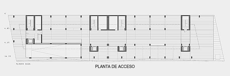 PLANTA BAJA. Acceso principal al edificio. En el módulo norte, dividido por entrada secundaria, Policía Local y Protección Civil. En el módulo sur, dependencias de Cruz Roja. Una escalera nos conduce a la planta superior.
